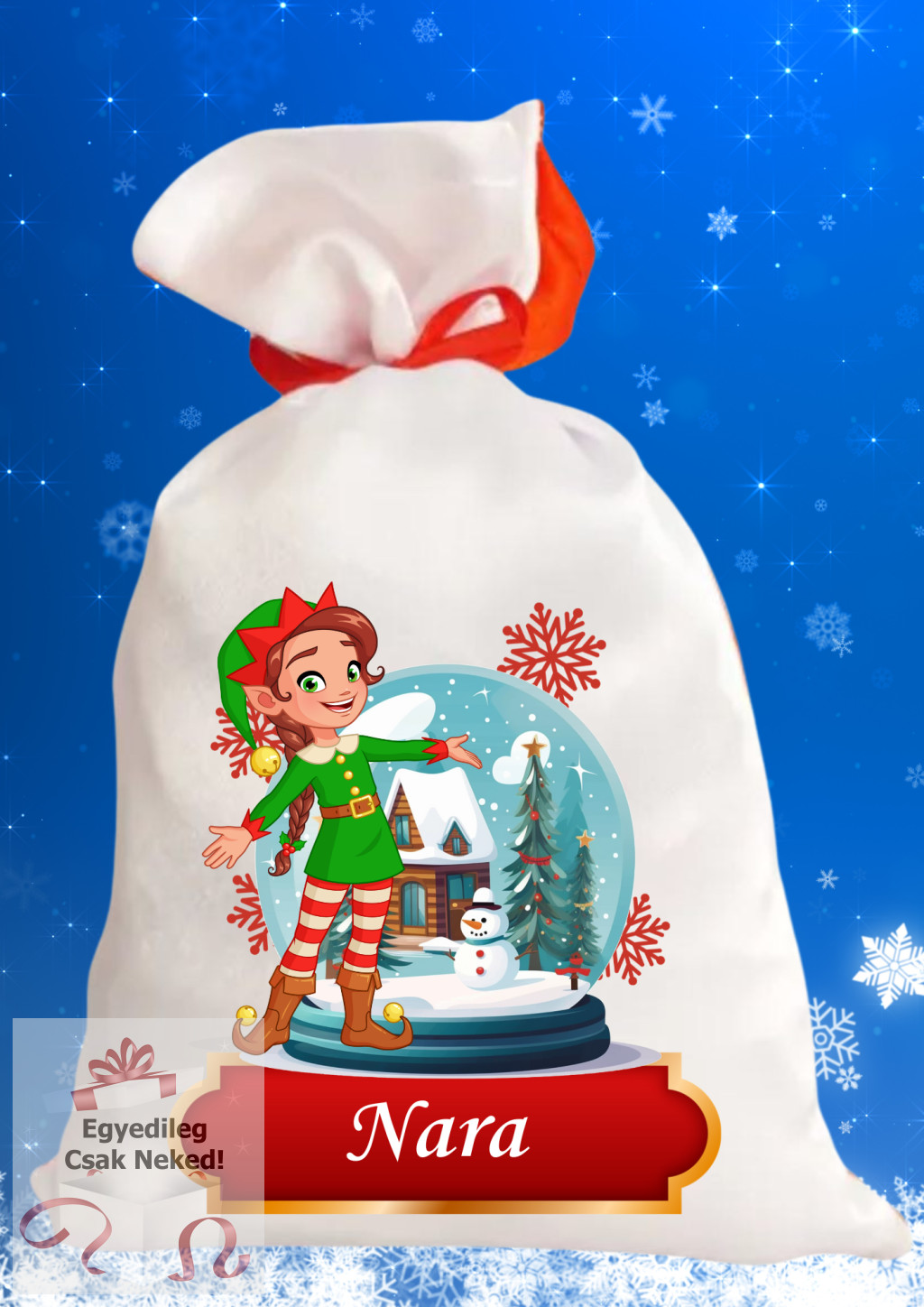 Anyaga: szaténMéret: 31 × 19,5 cmSzínezés: egyik oldala fehér, nyomtatott mintával, a másik oldala pirosZáródás: nem összehúzható; a csomaghoz mellékelt szatén szalaggal köthető meg (a szalag a zsák tartozéka)
